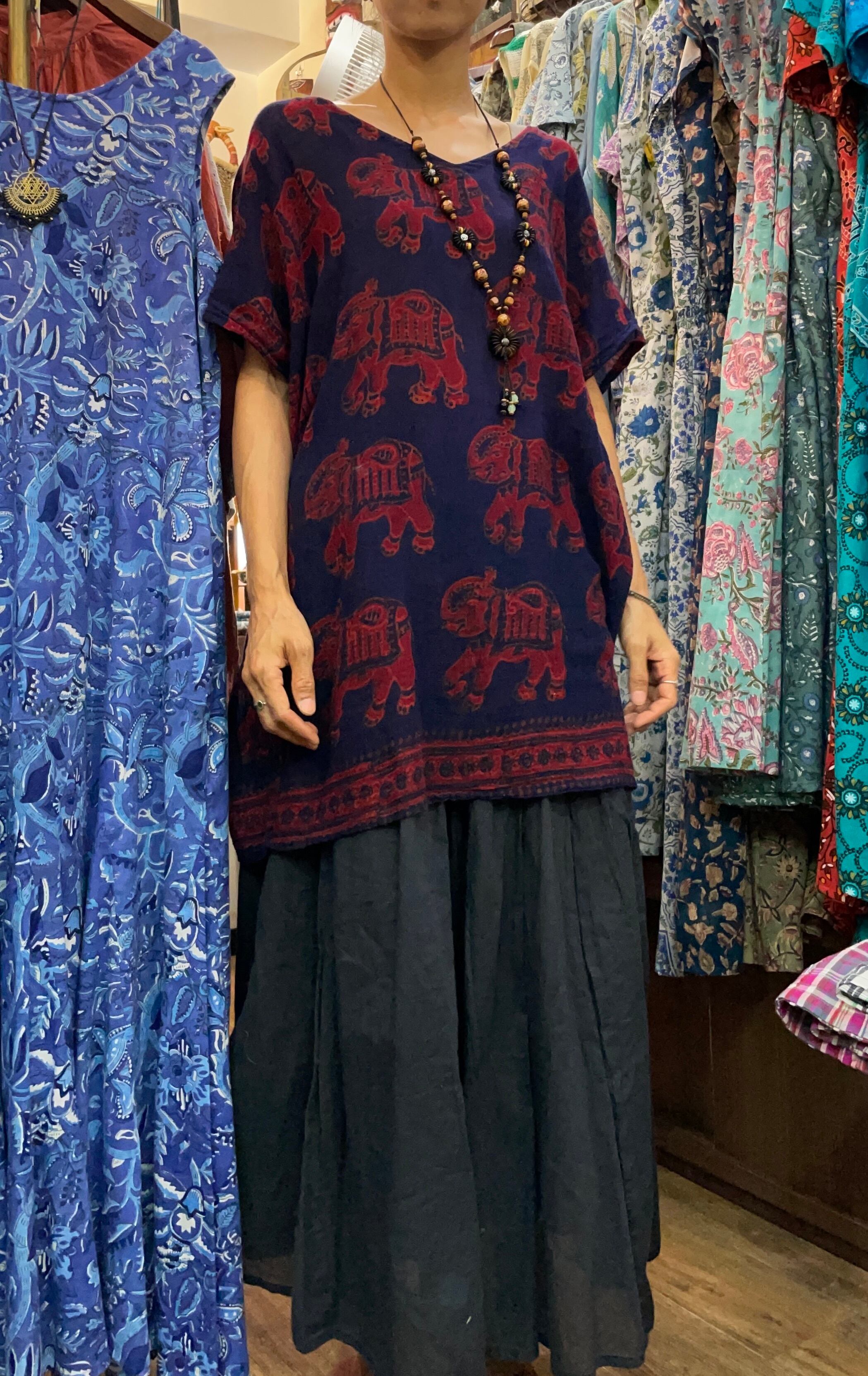 透け感のある薄手のコットンガーゼにゾウがプリントされたTOPです。